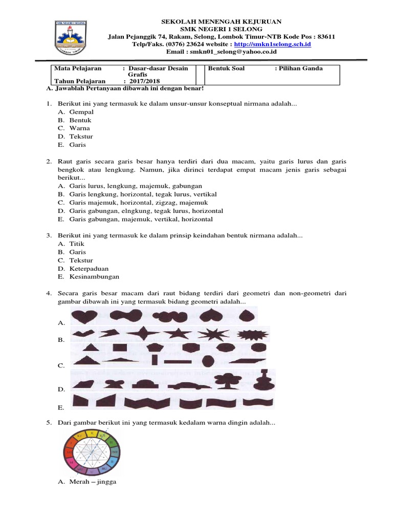 Semoga contoh soal dibawah ini bermanfaat bagi teman-teman semua bagi siswa yang mendekati ujian harus lebih banyak lagi belajar untuk mendapatkan nilai yang maksimal. Dengan adanya mata pelajaran ini kamu akan diajarkan dasar-dasar dari. Berikut adalah Soal UAS Dasar Desain Grafis SMK Kelas X 1.