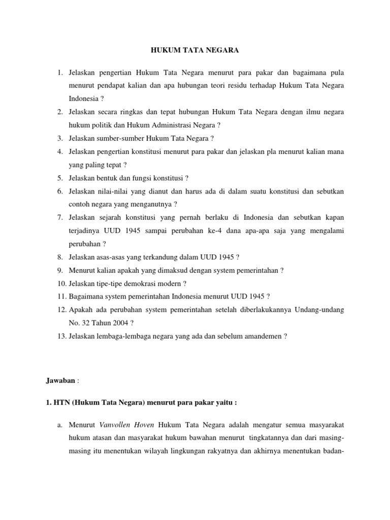 Soal hukum tata negara beserta jawaban. 20210323 12 pertanyaan dan jawaban hukum tata negara tanyain 1. Hukum yang mengatur antara negara dengan perorangan. Ketua dan wakil ketua b.