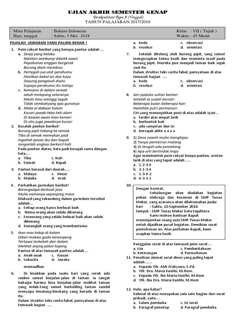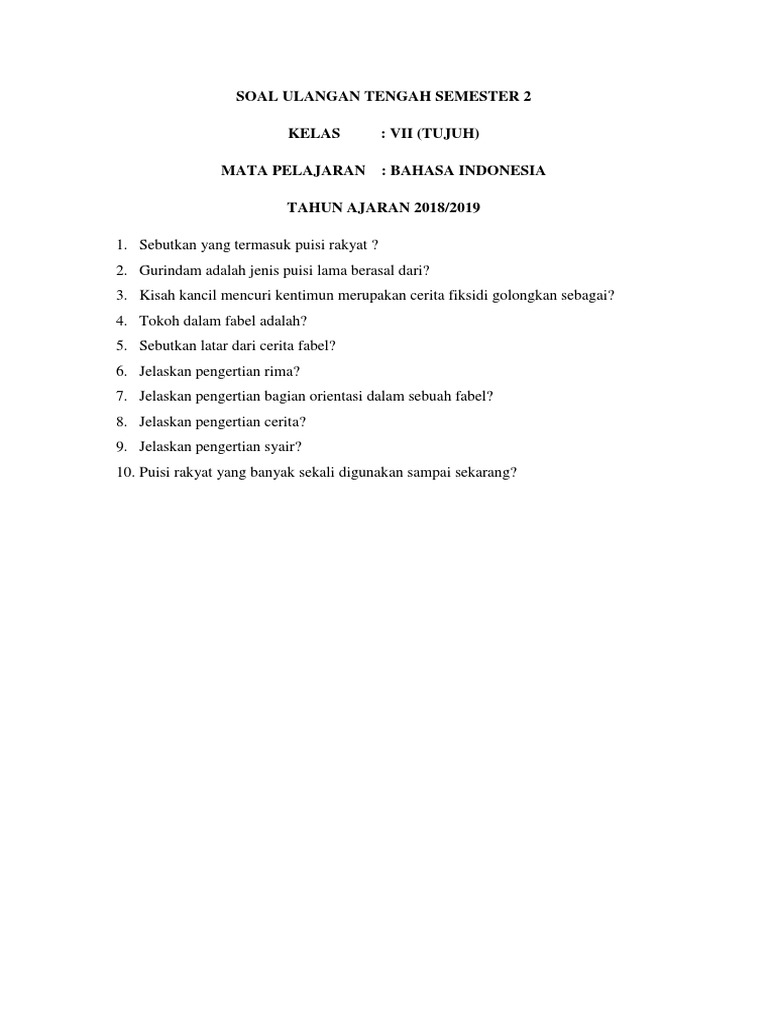 Soal uts b.indo kelas 7 semester 2 fabel syair gurindam. Download Soal Pts Bahasa Indonesia Kelas 7 Semester 2 PDF 1200 MB - SamPDF SamPDF SOAL PAT B INDONESIA KELAS 7 DAN JAWABAN SOAL LATIHAN ULANGAN UMUM UKK PAT SMP MTS KELAS 7. Soal UTS Bahasa Indonesia Kelas 5 Semester 2 Tahun Ajaran 20172018 Soal UTS Bahasa Indonesia Kelas 5 Semester 2 Terbaru Tahun 20182019 Kunci Jawaban room I 1b 2b 3b 4b 5a 6a 7d 8b 9c 10a 11b 12d. 20181201 Kumpulan Soal UTSUASUKK Bahasa Indonesia Kelas 7 SMPMTs Terbaru dan Terupdate - Adik adik dimanapun berada nah pada kesempatan yang baik ini kakak ingin berbagi beberapa contoh soal Ulangan Tengah Semester Ulangan Akhir Semester dan Ulangan Kenaikan Kelas yang disusun pada mata pelajaran Bahasa Indonesia kelas 7 SMPMTs.